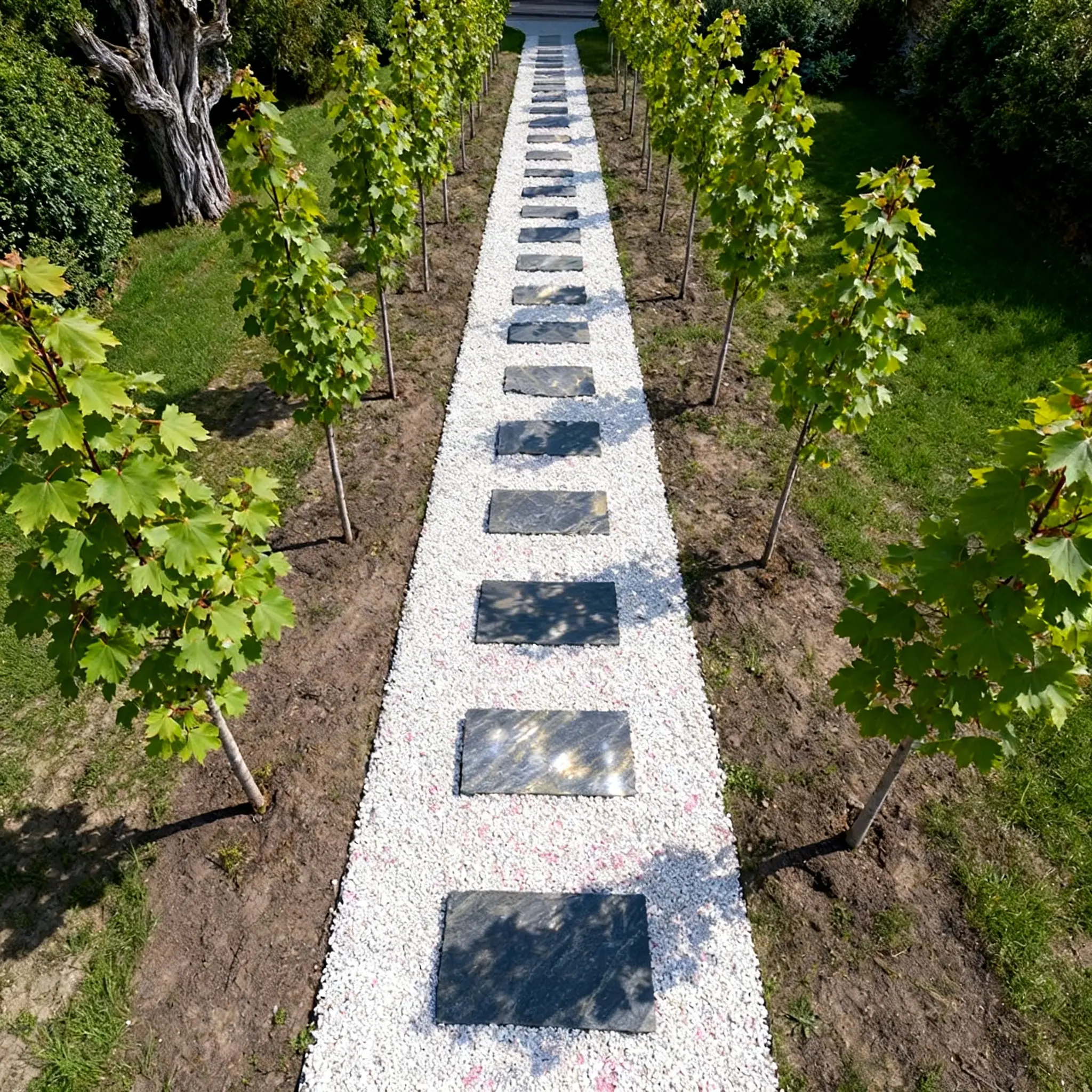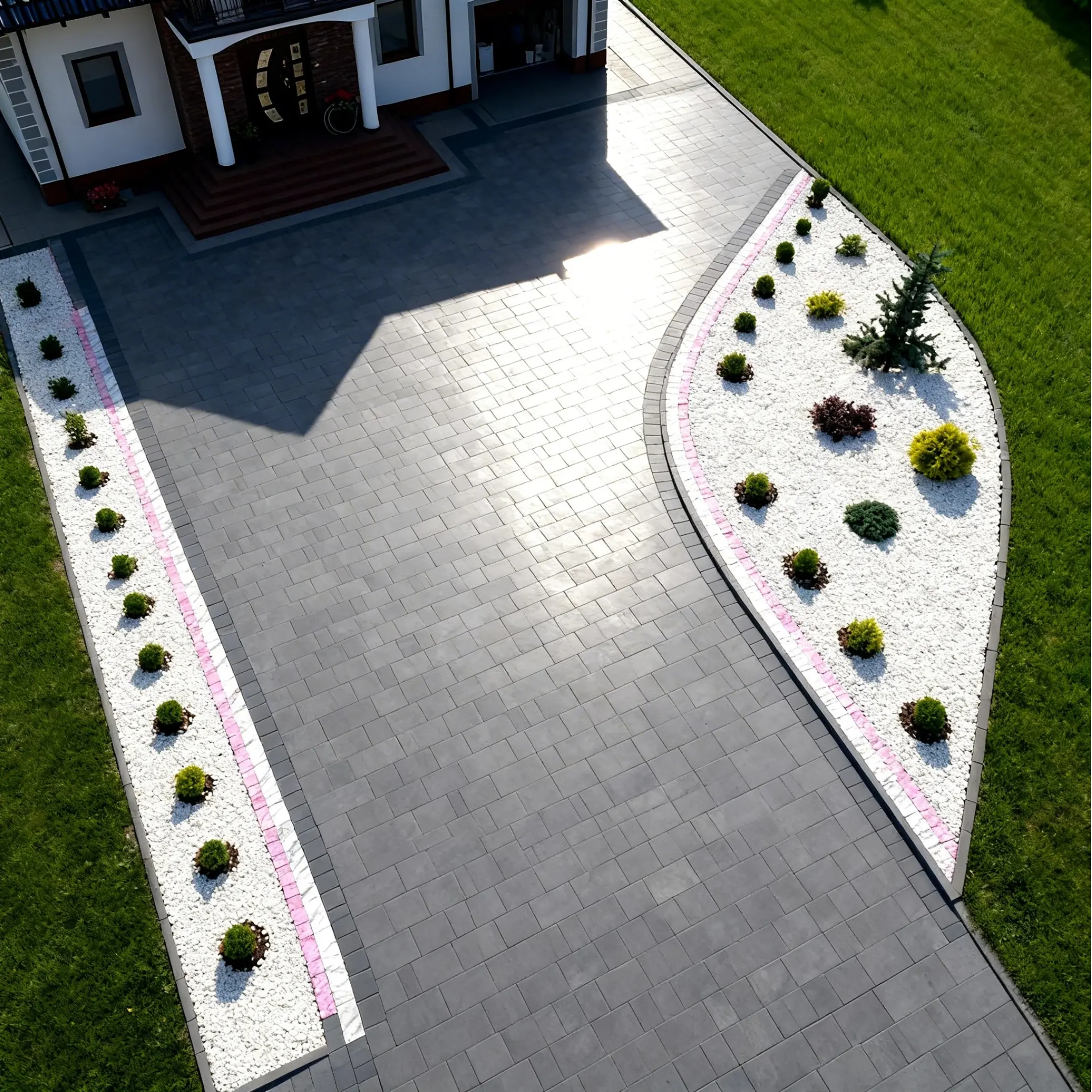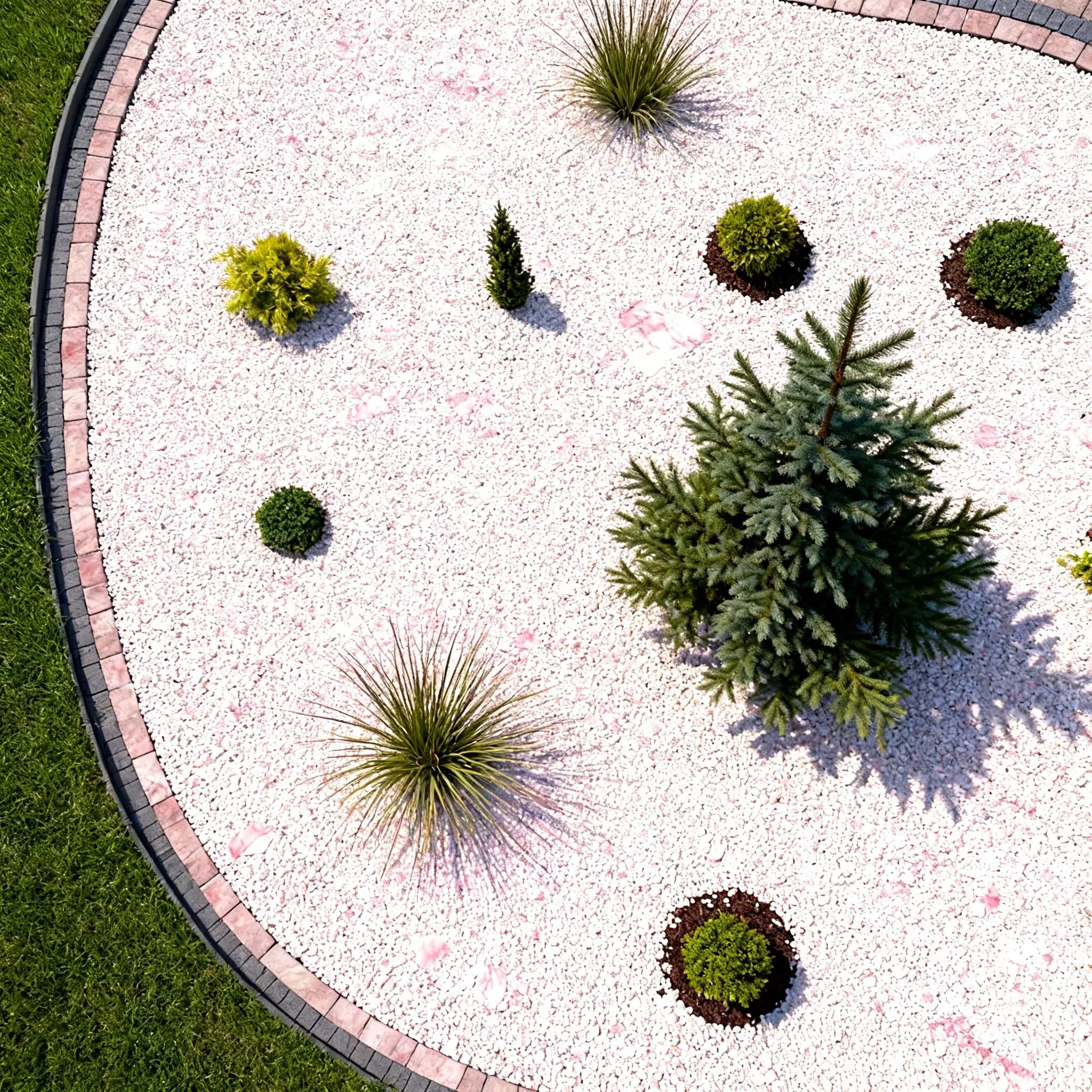 Drobna Biała Marianna doskonale komponuje się z ciemnymi kruszywami z oferty MUSPEL – grysami bazaltowymi, korą antracytową czy ciemnym granitem. Takie zestawienia pozwalają tworzyć nowoczesne, geometryczne układy i wyraźnie oddzielać strefy ogrodu bez potrzeby stosowania dodatkowych obrzeży.